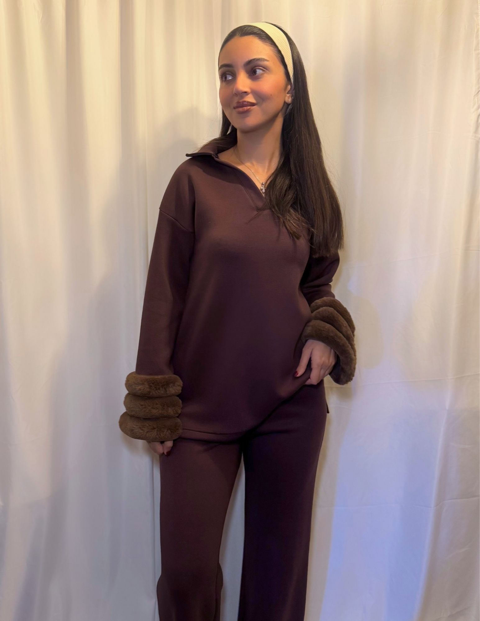 The Elan Set is all about understated luxury. Designed in a soft, cozy fabric to keep you warm, this set is elevated with fur detailing on the sleeves.